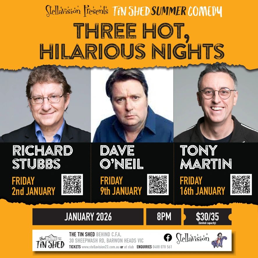 Summer comedy comes to the Tin Shed in Barwon Heads with three funny men and three big Fridays. Don't miss the best of the best. Three headliners front up with solid support acts including Stephanie Hare, Brad Oakes, Billy Stiles, Aaqib Merchant, Nadun Hetti and Akwasi Osei-Tutu.